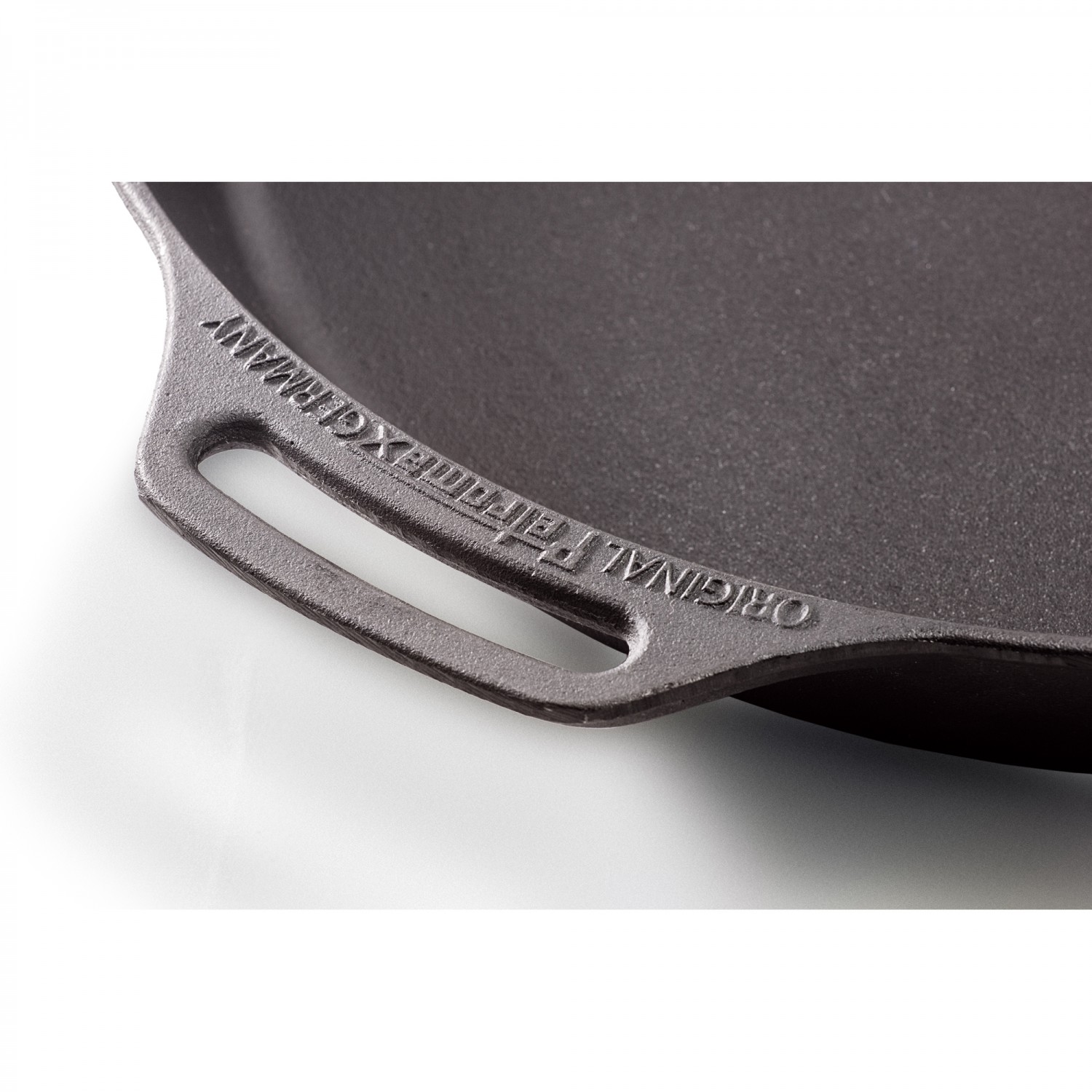 Die Gusseisenpfanne besitzt für ein sicheres Handling zwei Henkel sowie zwei Schüttnasen zum einfachen Abschütten des Inhaltes ohne Kleckern.